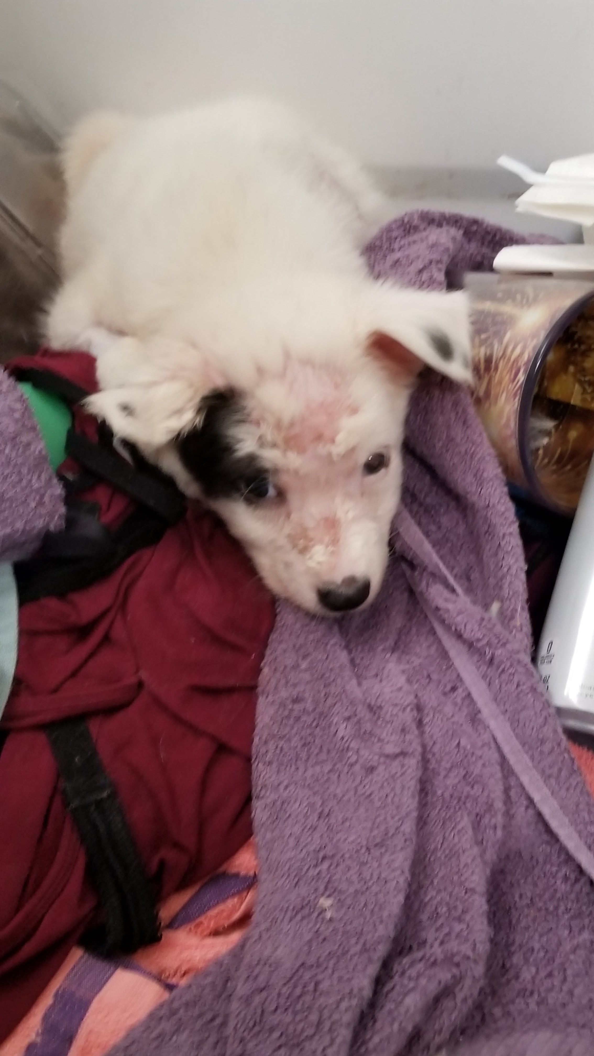 Baxter’s story began on December 3rd when a wonderful person was told by a worker at the dump that someone had dumped a puppy and he thought it was still alive. The puppy was found lying motionless, hidden between the dumpsters at the concrete wall. (The pup would not have been seen if not for the workman.) They scooped his near lifeless body up and cradled him in their arms as they rushed him to the shelter.