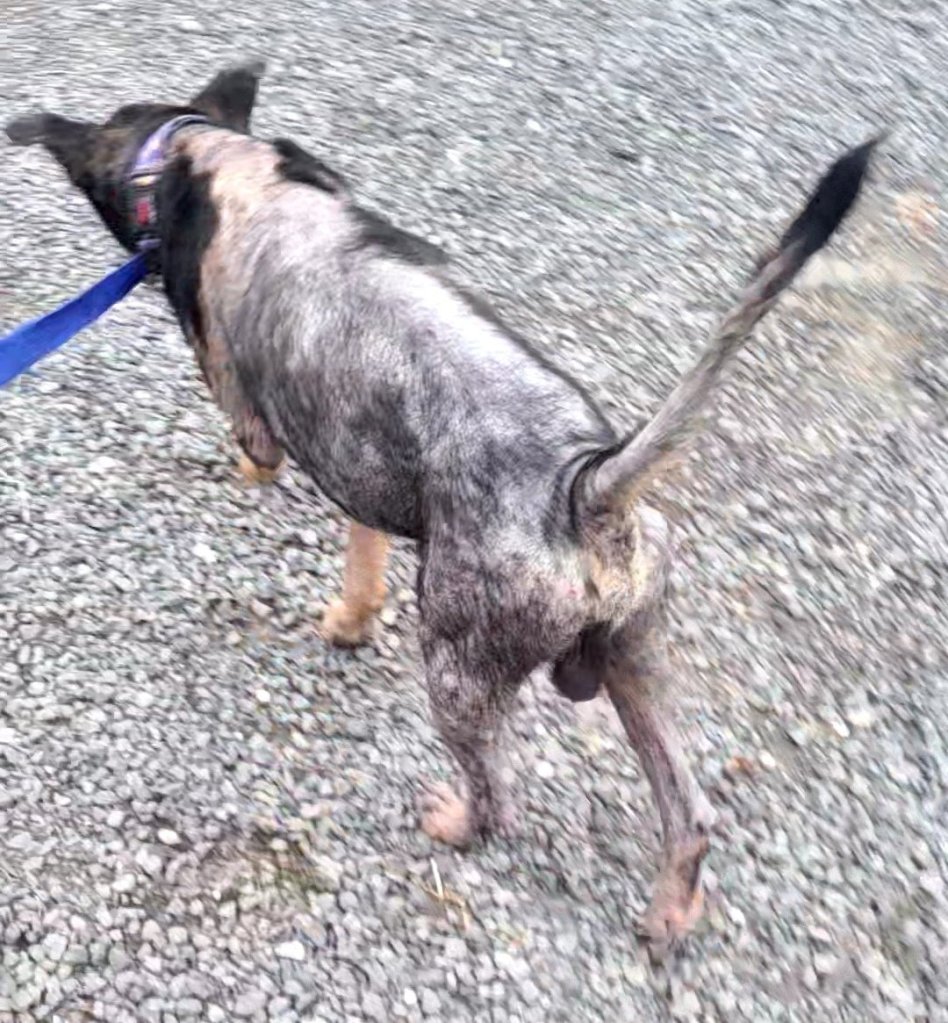Mr. Tony was found on island by a lovely (and straight-up dedicated!) human. She was impressed with his majestic 19 hairs just a’blowin in the wind, overcome by his magnificent natural aroma and pebbled scabtastic skin (of demodectic mange and associated infections), and let us not forget, his impressive knee-length testicles which probably could have been literally, πΆ thrown o’er his shoulder like a continental soldierπΆ. What’s NOT to love?!?