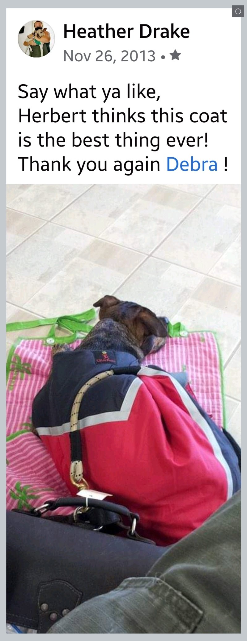 Today I received a text from Tony’s FoodLady. He LOVES his extra-warm cape coat and he knows it’s his because he picks it up and carries it to his kennel by himself. He likes to keep his special treasures with him all the time and would take them all with him everywhere if someone could please provide him with a Tony-sized shopping cart. π€£