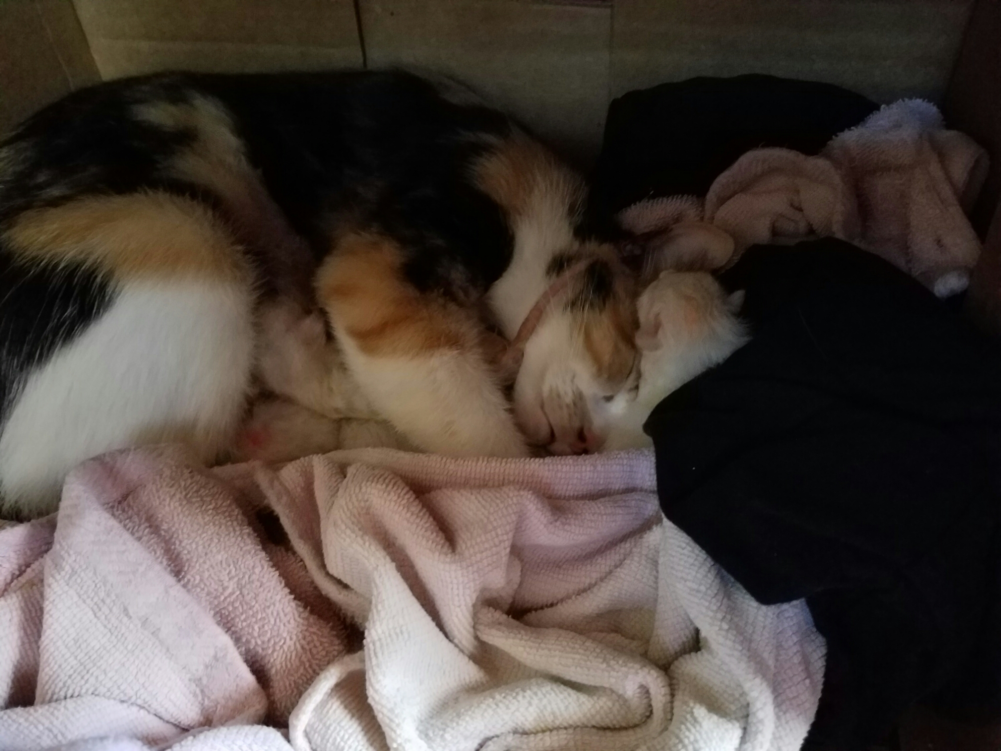 15:51 – I offered Lucille some canned food, water, and then some warmed kitten milk replacer. She refused water, ate some of the food and nommed most of the warmed kitten milk. She is snoozing intermittently while the two white kittens (rats) nurse. Everyone seems healthy and calm.
