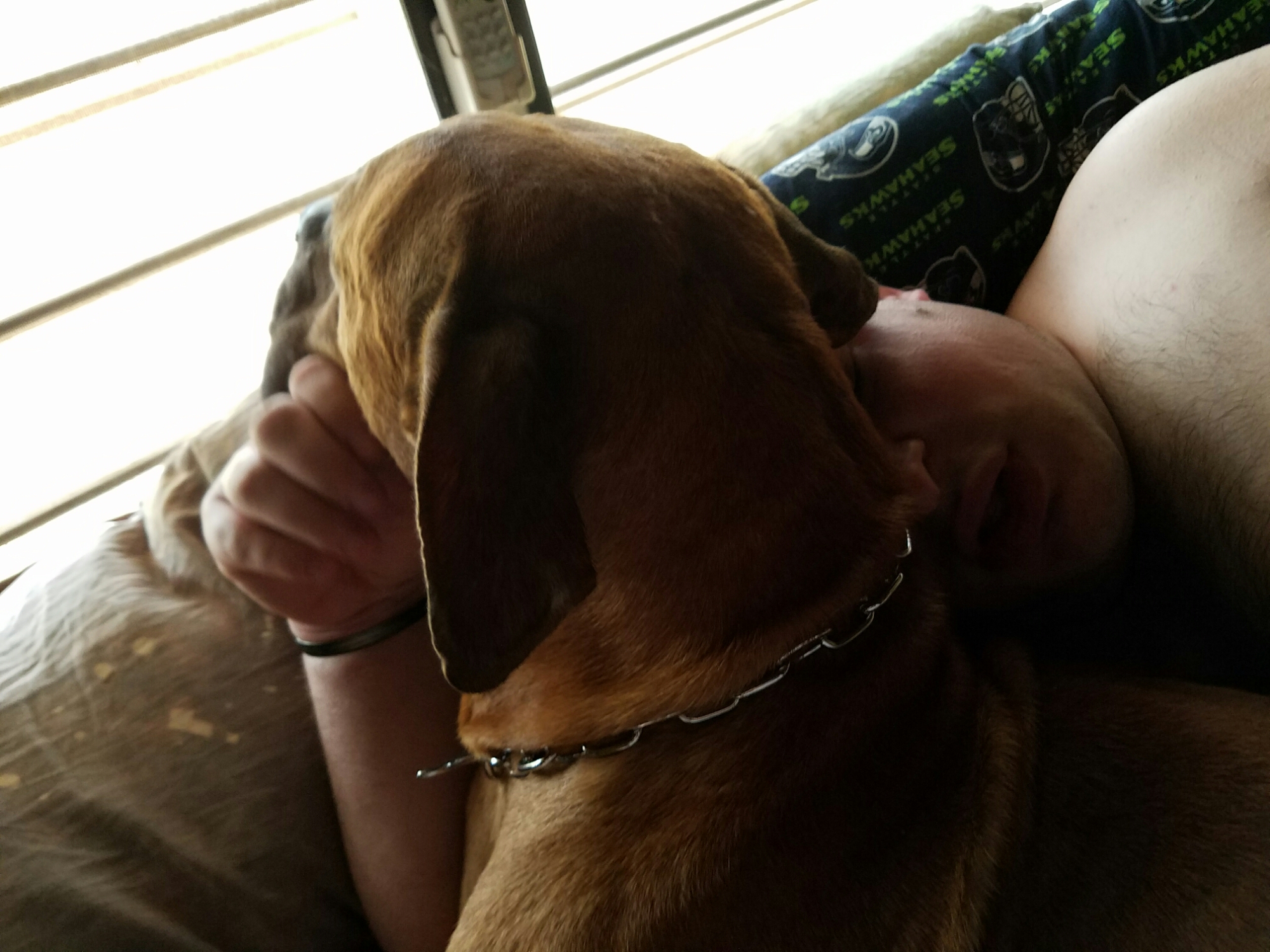 Dear Humphrey, you beloved asshole, I welcomed you into our home because, dude, your previous life was shit. You didn’t really realize your life was shit because you have a giant heart and people are your favorite things EVER! But you were chained for the first 3-4 years of your life and until you were lucky enough to get new neighbors who couldn’t handle the deplorable conditions you were kept in, you played with the only thing you had, your chain. Sadly, chewing on a tow chain for almost 3 years completely destroyed many of your teeth and as soon as we can afford it (have Herbert’s vet bill 75% payed; down to less than $1000 now!) we will have all of those broken teeth removed. They have to be painful, but your heart is so big–you don’t show it. Speaking of your sweet heart, yours is full of worms. We are treating that and have been since you arrived and it’s going pretty well. You are also, unfortunately, a cat-hunter and that SUCKS. I hate it and I was really hoping to train that out of you, but it is not going well – your brain has been conditioned that cats are food and I’m currently using segregation methods to keep everyone safe (kittens safe from you; you safe from me if you were to hurt the kittens). I accept all of these things about you and am doing my damndest to make your life awesome, but this morning I’m not going to lie – I was a little shocked. If you had showed up with a German Shepherd-like coat I would have been prepared, but not with your thin short coat. This morning you began what dog people call, “blowing your coat”. Yep, you are losing the thinner, softer, insulating (?!) fur and it is just freaking weird (to me) on a short-haired dog.