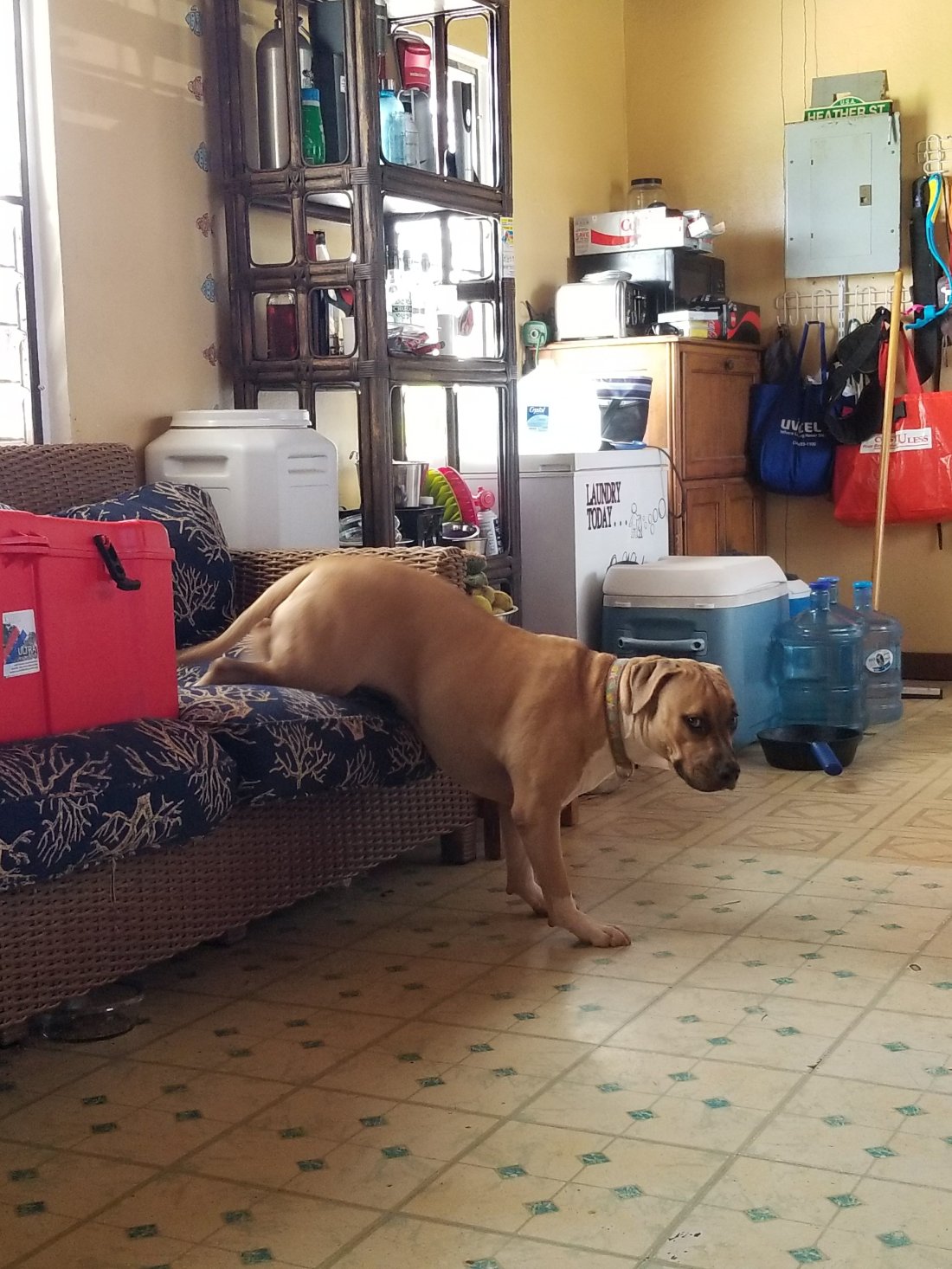 Humphrey was quite literally a pet project of a woman who has now become incredibly valuable to the animal welfare of this island. She moved into a home and Humphrey lived, a classic case of neglect, tied to the fence at the edge of her property. Her & her husband befriended this dog, feeding him and giving him attention to the point of building him a shelter, and the husband walking him. It is my belief that these interactions were Humphrey’s first introduction to affection and he was (and is) a fan. I have some opinions about hugging dogs that can be simplified into “generally do not,” but Humphrey seems to actively seek them out. When I thought about it for a while, it made sense to me. His first FoodLady provided him with affection, food, and attention and probably hugged him. This poor dog, never having been well-socialized with other dogs and appeared to have been tied up and ignored by humans until his first FoodLady moved in next door, learned that hugs were how you show love.